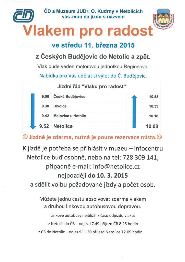Vlakem pro radost se můžete svézt ve středu 11. března 2015. Vlak bude veden motorovou jednotkou Regionova z Českých Budějovic do Netolic a zpět. Můžete si udělat výlet do Č. Budějovic. Jízdné je zdarma, nutná je pouze rezervace místa na tel: 388 324 251, na e-mail: info@netolice.cz nebo osobně v muzeu - infocentru Netolice.