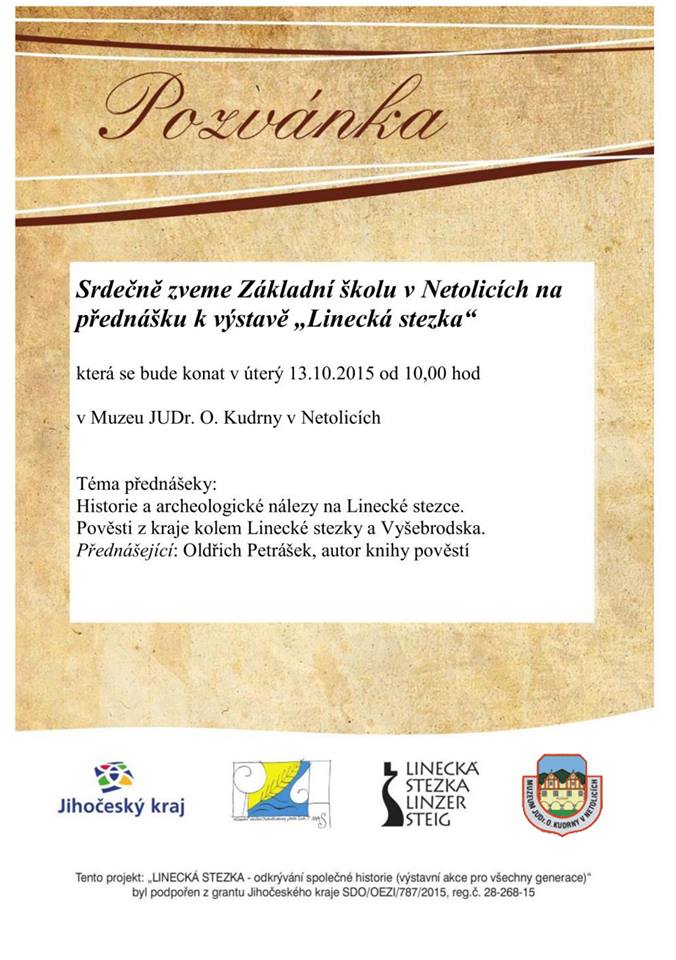 Prohlídka výstavy cca 15 minut a přednáška v muzejním salonku cca 45 - 60 minut na téma historie, archeologické nálezy na Linecké stezce a také pověsti s ní spojené.