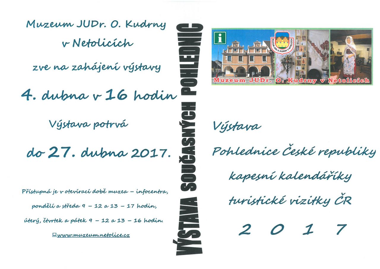 Výstava byla zahájena 4. 4. 2017 v 16 hodin, výstavou přítmoné provedl Mgr. Marcel Goetz a pan Miloš Dědič obdaroval přítomné jedním vyndrákem českým - bankovkou pohádkového krále Václava Vydry. Prohlédnout si pohlednice, vizitky, kalendáříky bude možné do 27.4.2017 v otevírací době infocentra. Po a St 9 - 12 a 13- 17; út, čt a pá 9 - 12 a 13 - 16 hodin.