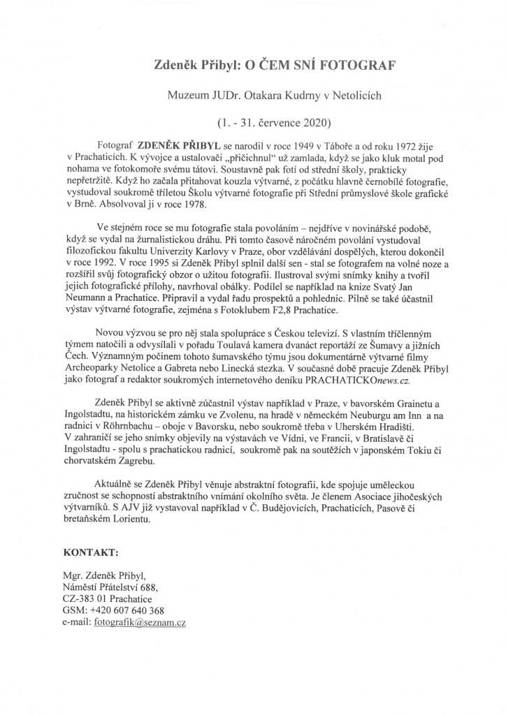 Autor výstavy je členem Asociace jihočeských výtvarníků. Do Netolic se se svou výstavou fotografií vrací po sedmi letech.